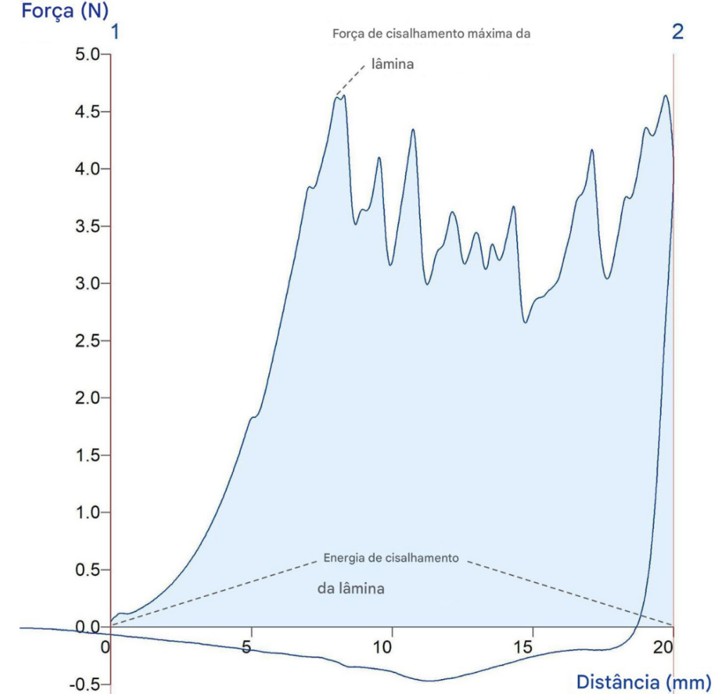 - Energia de cisalhamento com lâmina de barbear (N·mm): calculada como a área sob a curva força × deformação